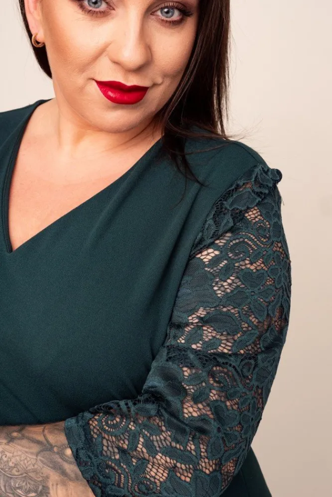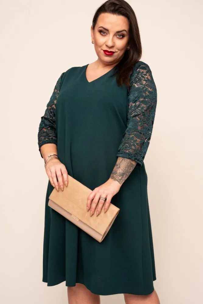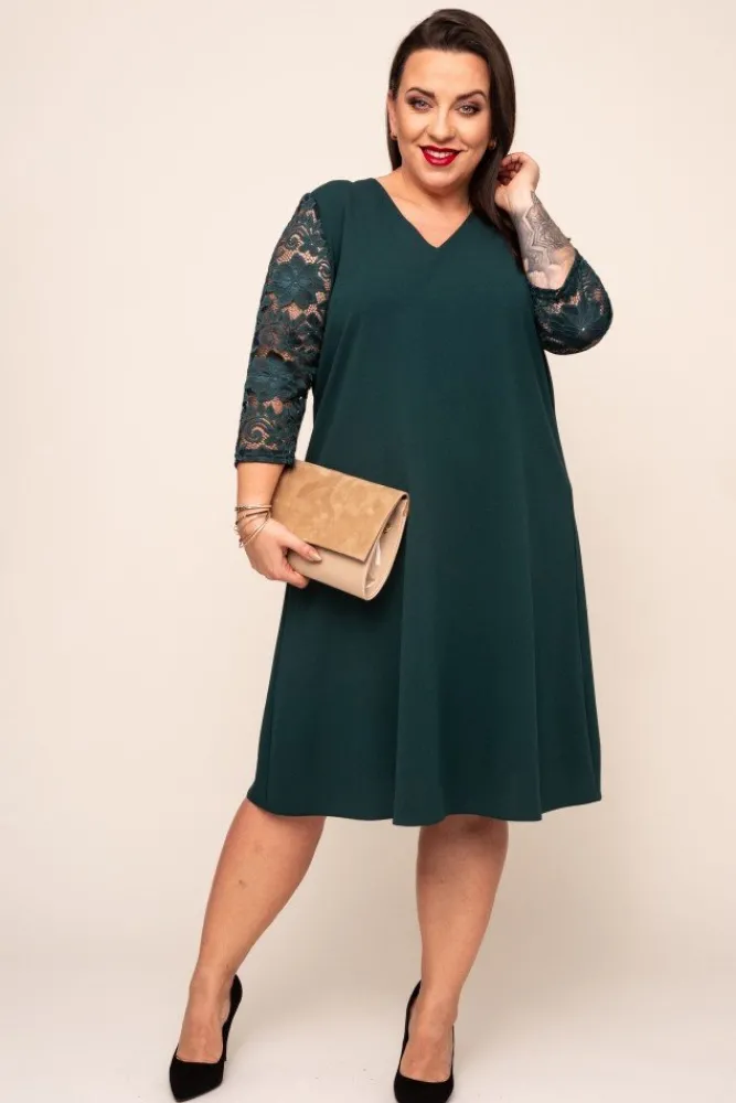 Polski Zielona Sukienka z koronkowym rękawem EVE