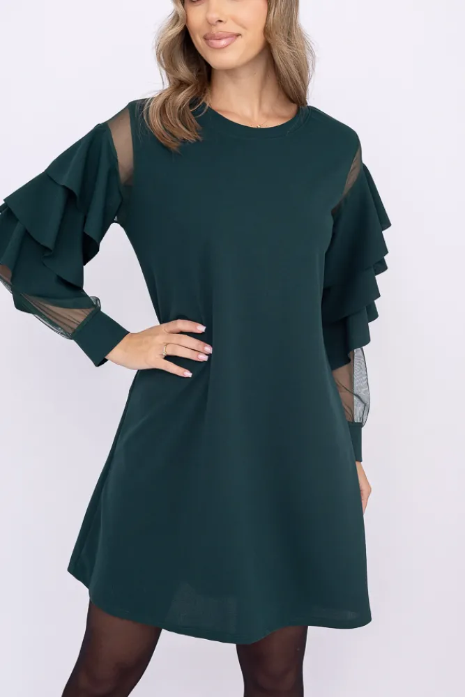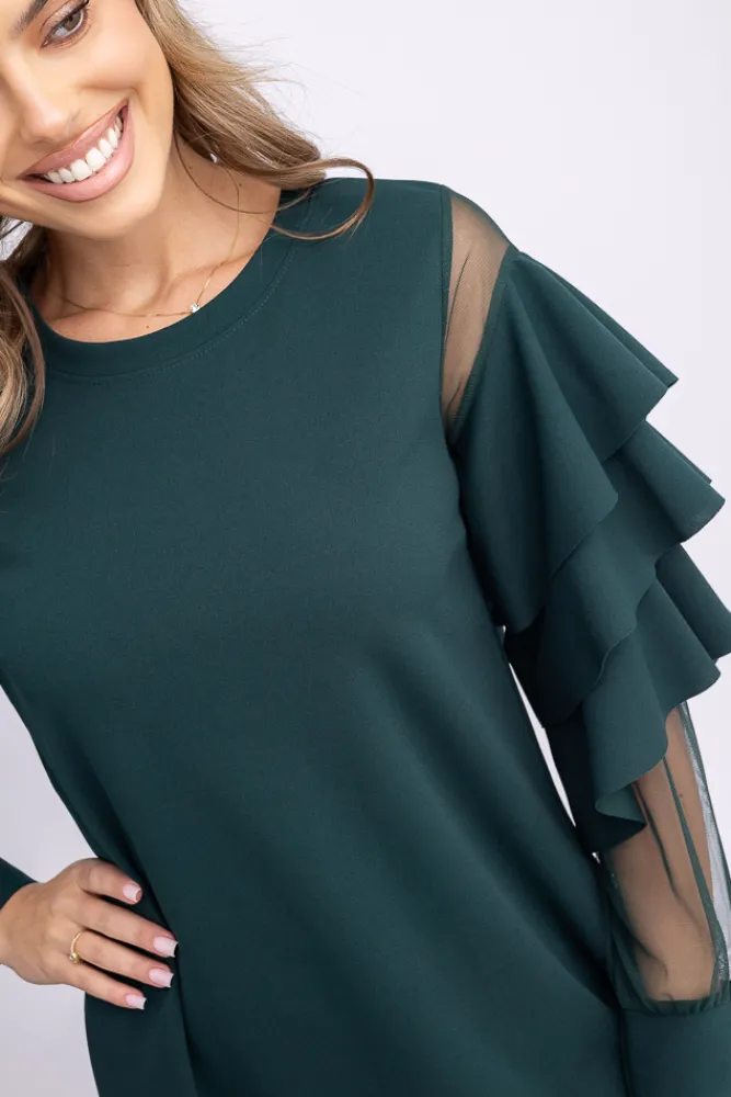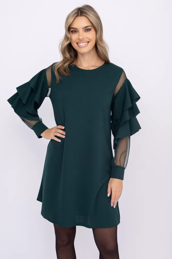 Włoski Butelkowozielona Sukienka z falbanami DARIEN