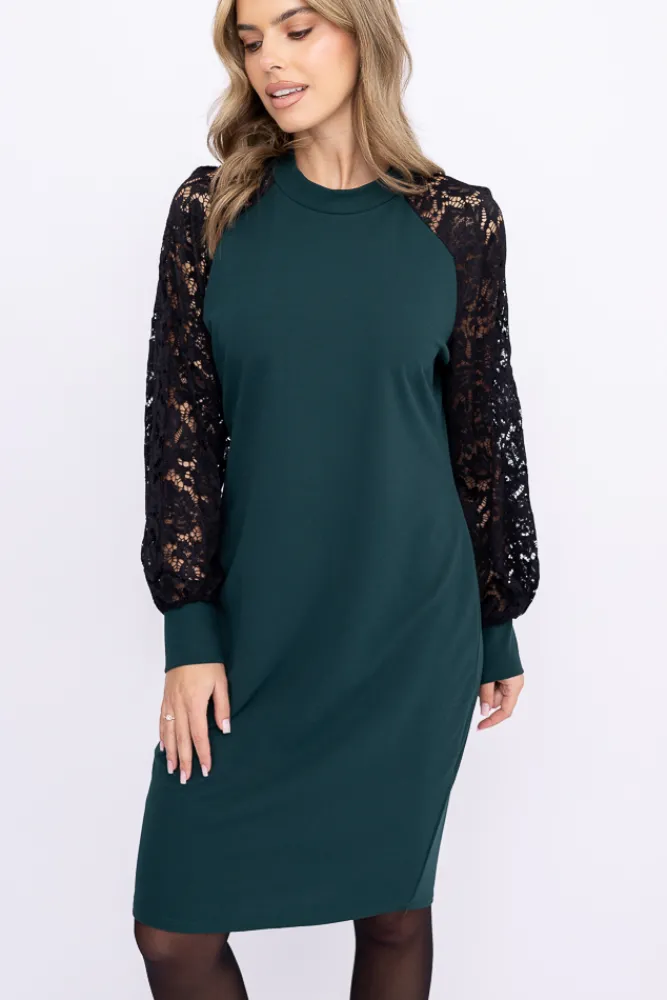 Włoski Butelkowozielona Sukienka z koronkowymi rękawami LESTER