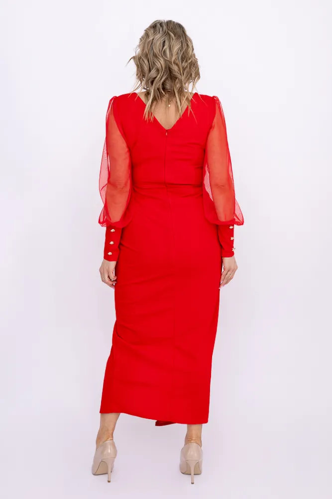 Włoski Czerwona Sukienka z prześwitującymi rękawami MERVIEN