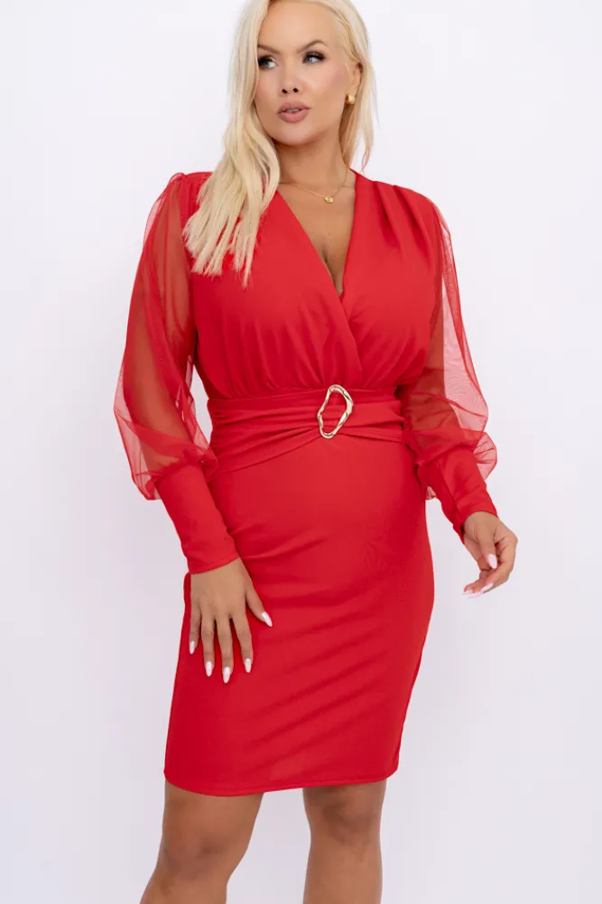 Włoski Czerwona Sukienka z prześwitującymi rękawami VIZENTI