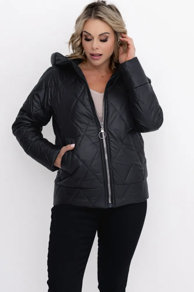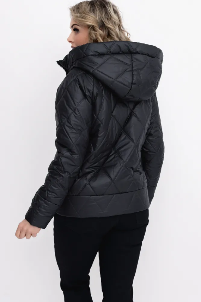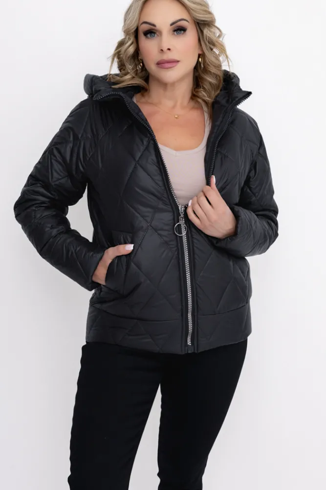Damskie Polski Czarna Kurtka pikowana z kapturem MERMENDI