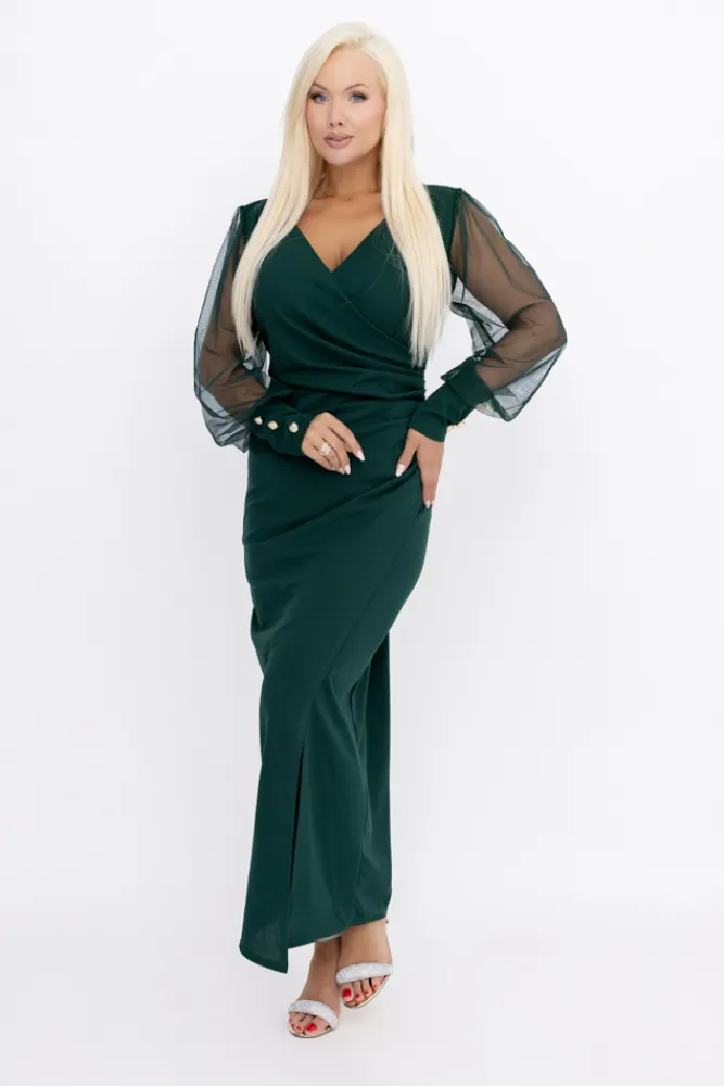 Włoski Butelkowozielona Sukienka z prześwitującymi rękawami MERVIEN