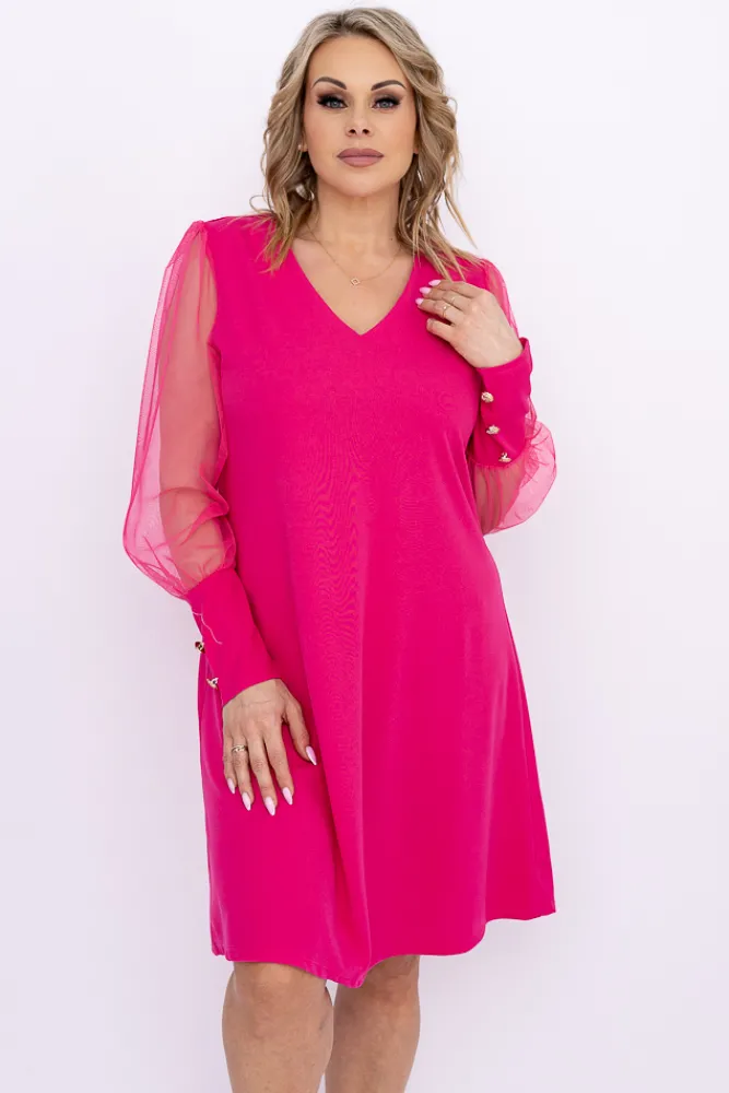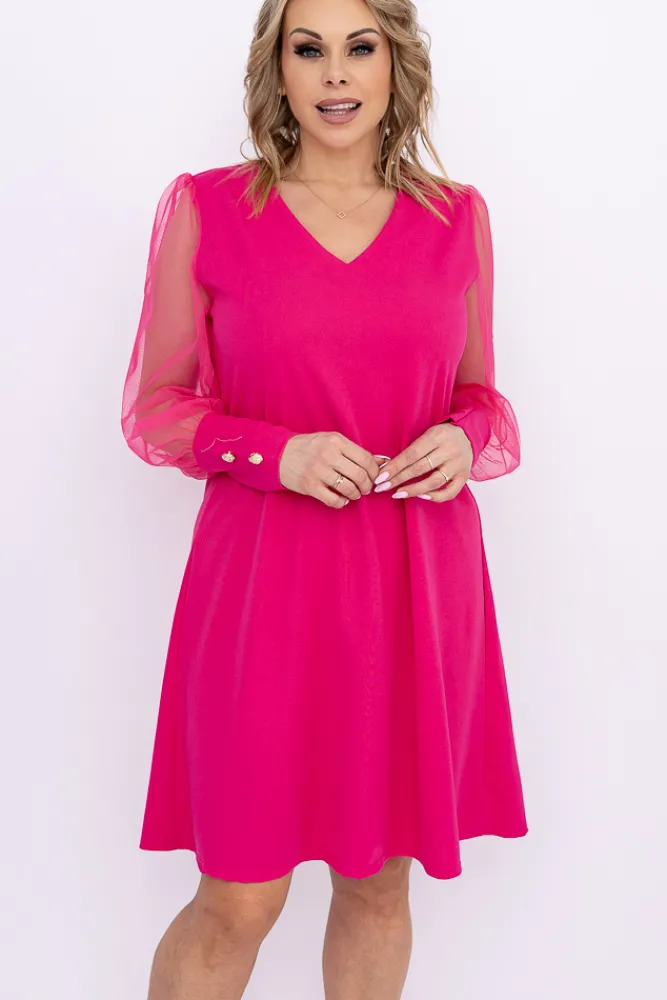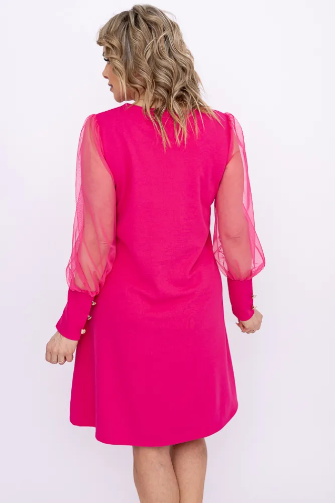 Włoski Fuksjowa Sukienka z prześwitującymi rękawami KAMENY